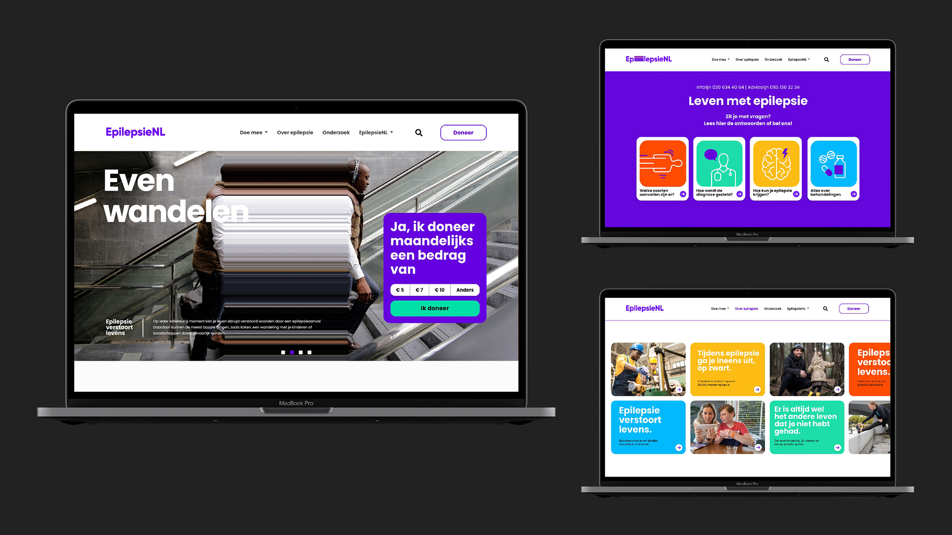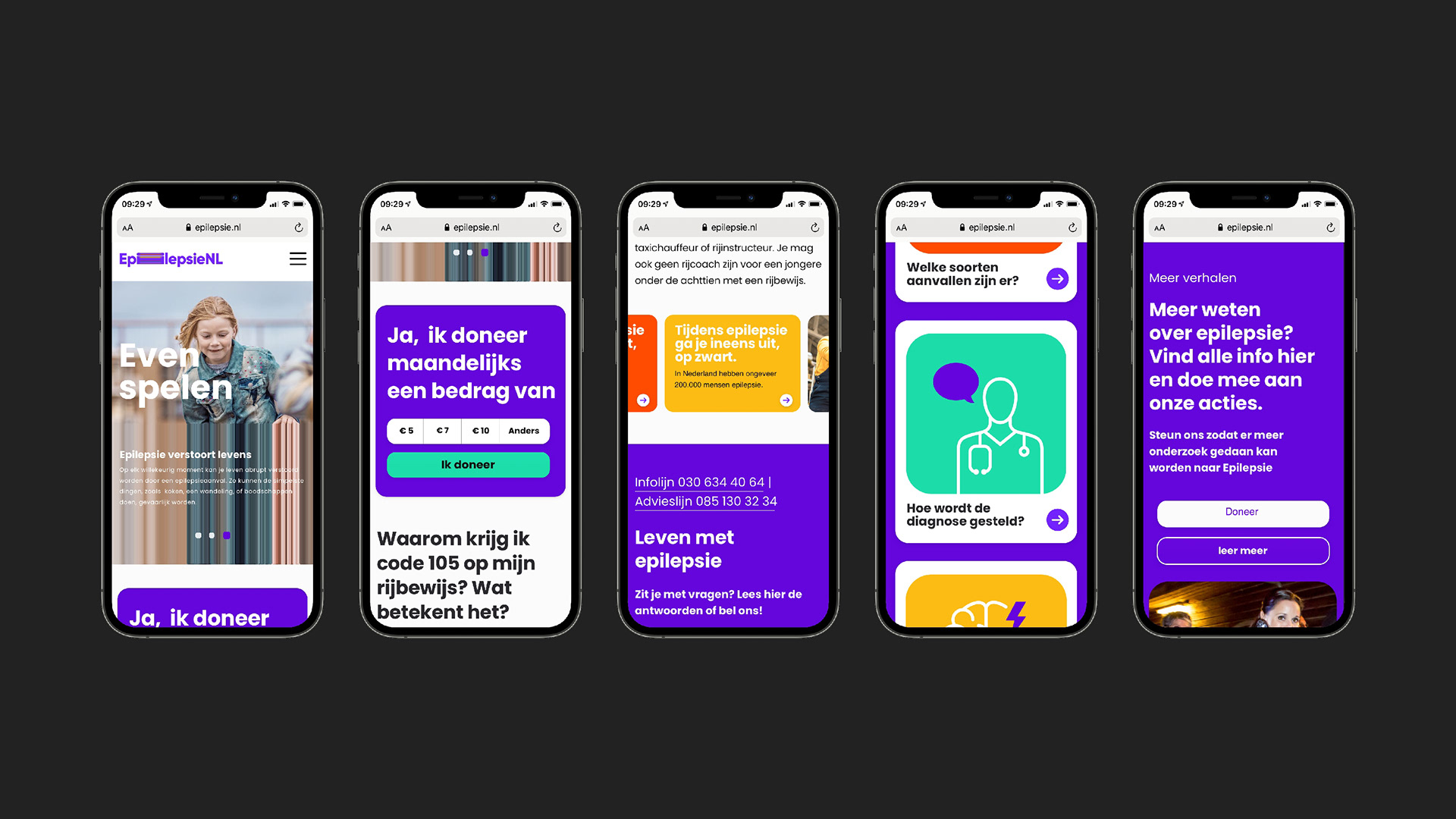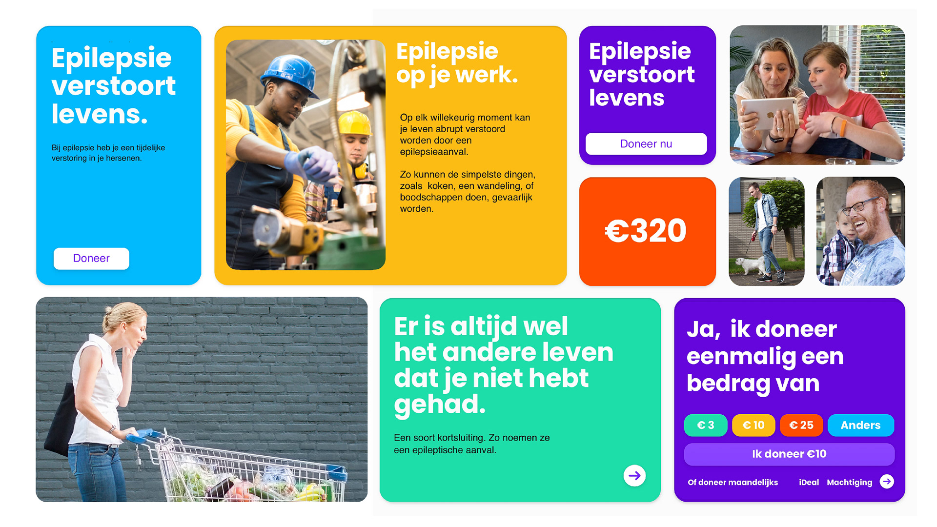 We made the new branding and marketing style for EpilepsieNL. The basis is a stretch effect that disrupts the logo and images used in advertising, etc. The stretch visualizes the disruption an epilepsy attack enacts on the person. The unique graphic imagery does its work everywhere. And even without images, the logo shows exactly what the impact of epilepsy is. The primary color of the style is a lavender purple, which is the color of International Epilepsy Day, because of lavender’s positive effect on people with epilepsy. Each element contributes to the message: epilepsy disrupts lives.